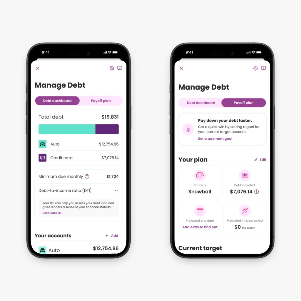 Designed a debt management tool featuring a dashboard for total visibility and a customizable Snowball or Avalanche payoff plan.